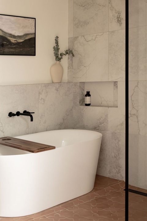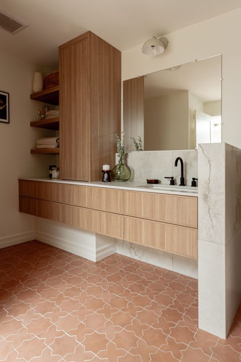 Le sol, habillé d’une céramique terracotta, apporte caractère et audace aux espaces. Quant aux murs, ils sont eux parés de tuiles d’inspiration travertin, affichant avec élégance le contraste doux et réfléchi du lieu.
