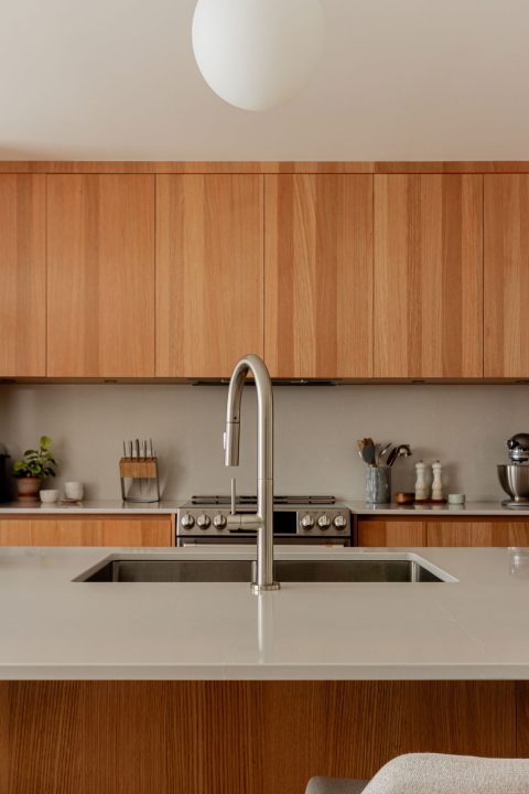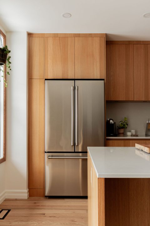 La cuisine a été entièrement pensée et conçue autour de son nouvel îlot central de 12 pieds linéaires, qui s’affirme comme un véritable espace de rassemblement familial. Les armoires en mélaminé Finsa, en teinte chêne, apportent une chaleur naturelle à la pièce, tandis que le comptoir et le dosseret Desert Silver (Silestone), par leurs veines fines et claires, ajoutent à l’espace une finition plus minérale.