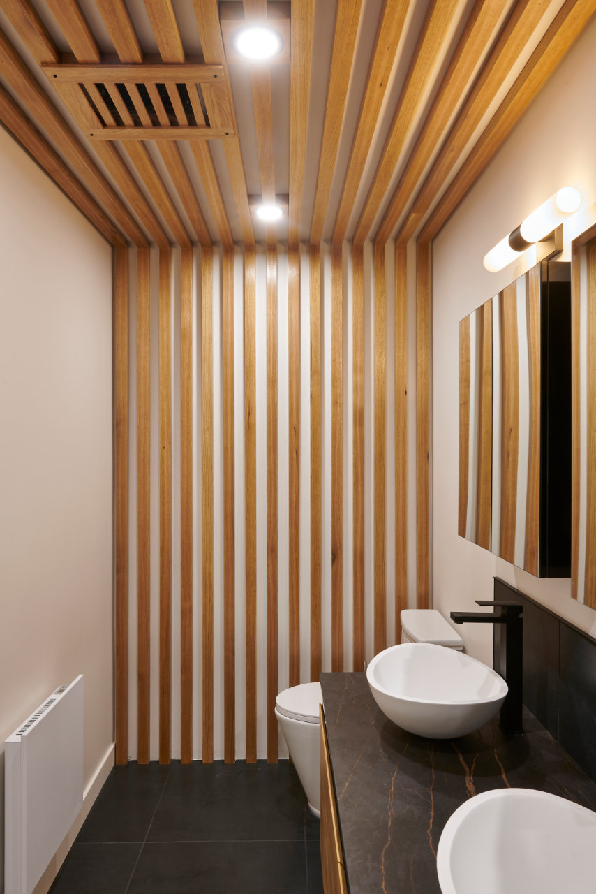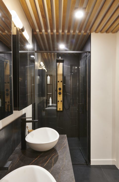 La salle de bain des maîtres a été transformée en un véritable sanctuaire de bien-être aux matériaux nobles et aux lignes épurées. Dans cet intérieur luxueux, les lattes de bois vernies cernent les murs et les plafonds jusqu’à se rendre dans la douche. Ces éléments apportent une profondeur visuelle et une élégance intemporelle, en parfaite harmonie avec le style recherché.