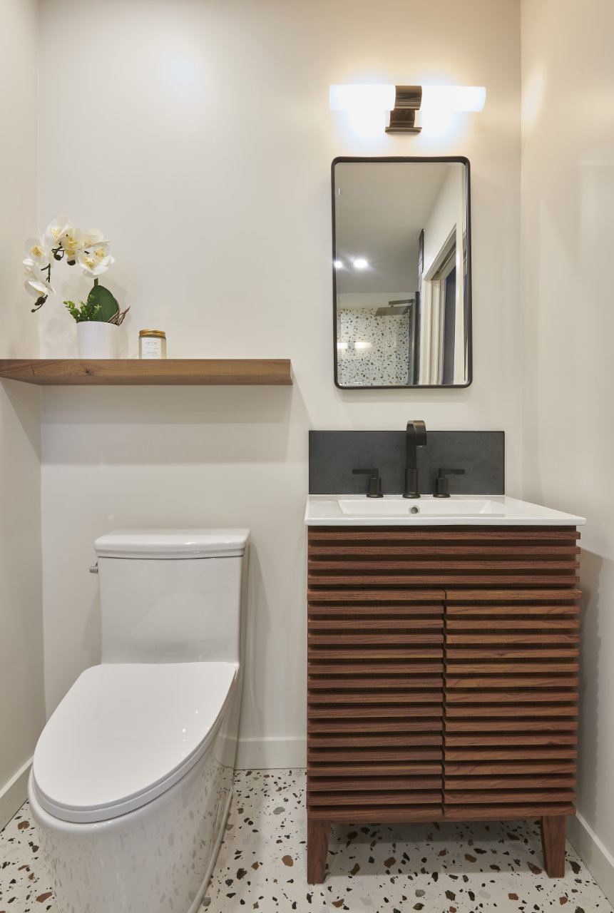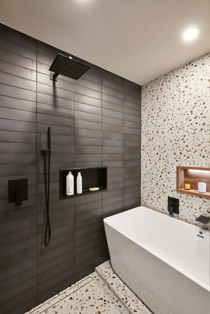 La salle de bain des invités se distingue par son design épuré et raffiné. Le sol prolonge sur le mur du bain sa finition de terrazzo “Padua Blanco”, contrastant magnifiquement avec les tuiles noires “Stromboli black city” des autres murs. L’espace révèle une atmosphère minimaliste et luxueuse, dont la douche à l’italienne et la baignoire îlot sont au centre de l’aménagement.