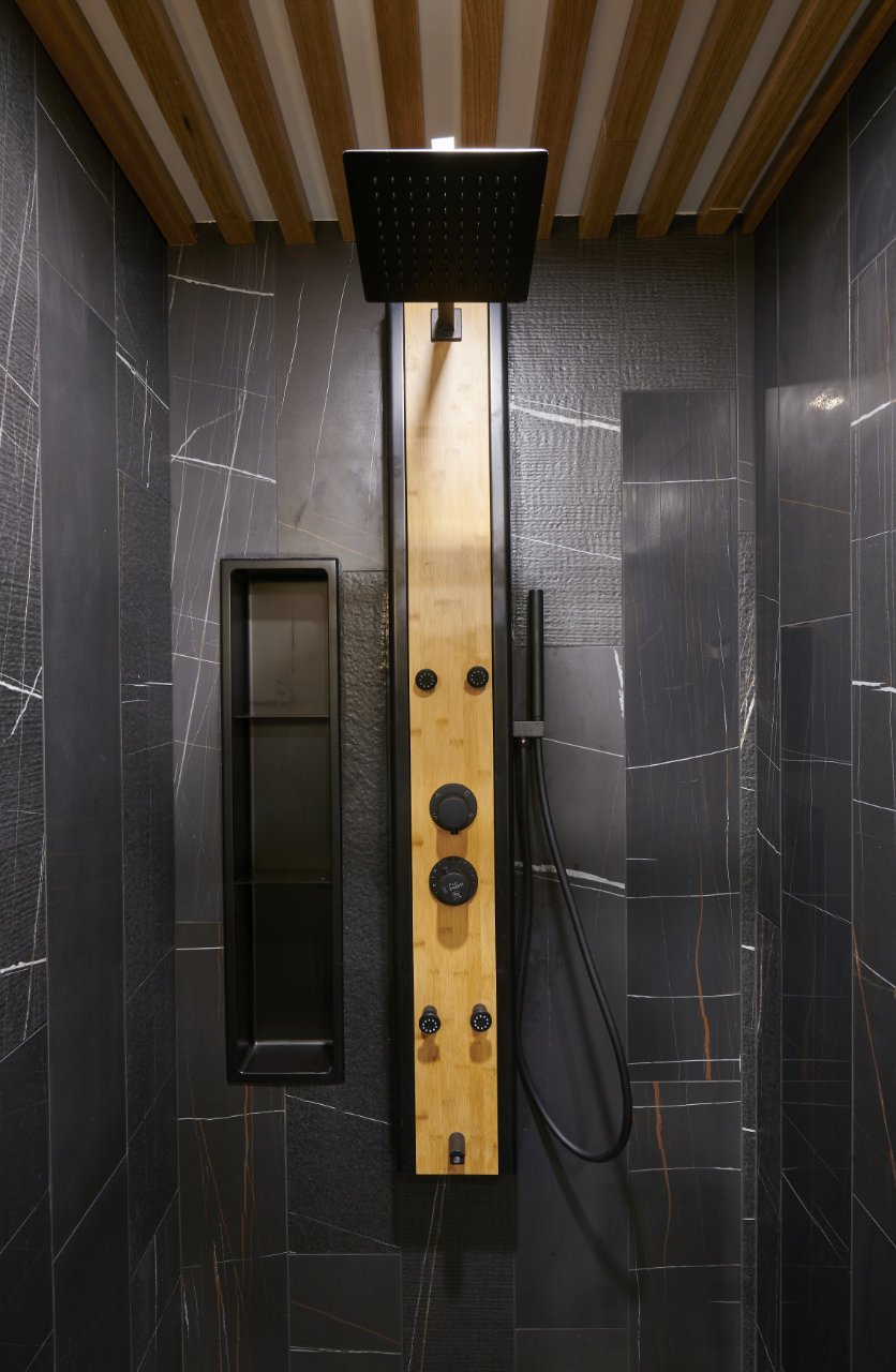 Le sol en grès cérame de la collection Paris de Novabell évoque la beauté des surfaces en résine, tandis que les murs de la douche, habillés de “listels Mix de Marble” en grès cérame, entrent en contraste avec les murs blancs. Une vanité suspendue avec double vasque, surplombée d’un comptoir en Dekton Laurent, complète la richesse de l’agencement en s’accordant parfaitement à la couleur du bois et des éléments de la douche. La douche, équipée d’une colonne à jets multiples, offre une expérience de massage personnalisée, tandis que les éléments de plomberie sont parfaitement assortis pour un rendu harmonieux et délicat.