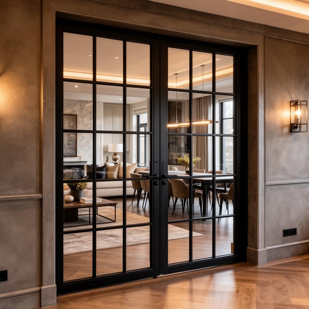 Portes intérieures en verre clair, givré ou teinté avec cadres en acier noir, aluminium ou bois.
